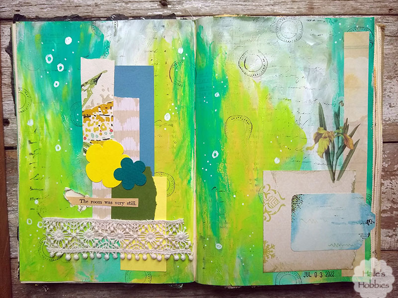 I don’t love the washi flower sticker on the right side of the page but I knew if I tried to pull it back up I’d pull paint from the fragile page.