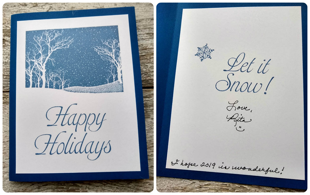 I always enjoy handmade cards and was lucky enough to get two in the mail this year. The first was from Rita of SoulComfort’s Corner. We’ve been pen pals for a couple years now…although, truth be told, I’m a really crappy pen pal.