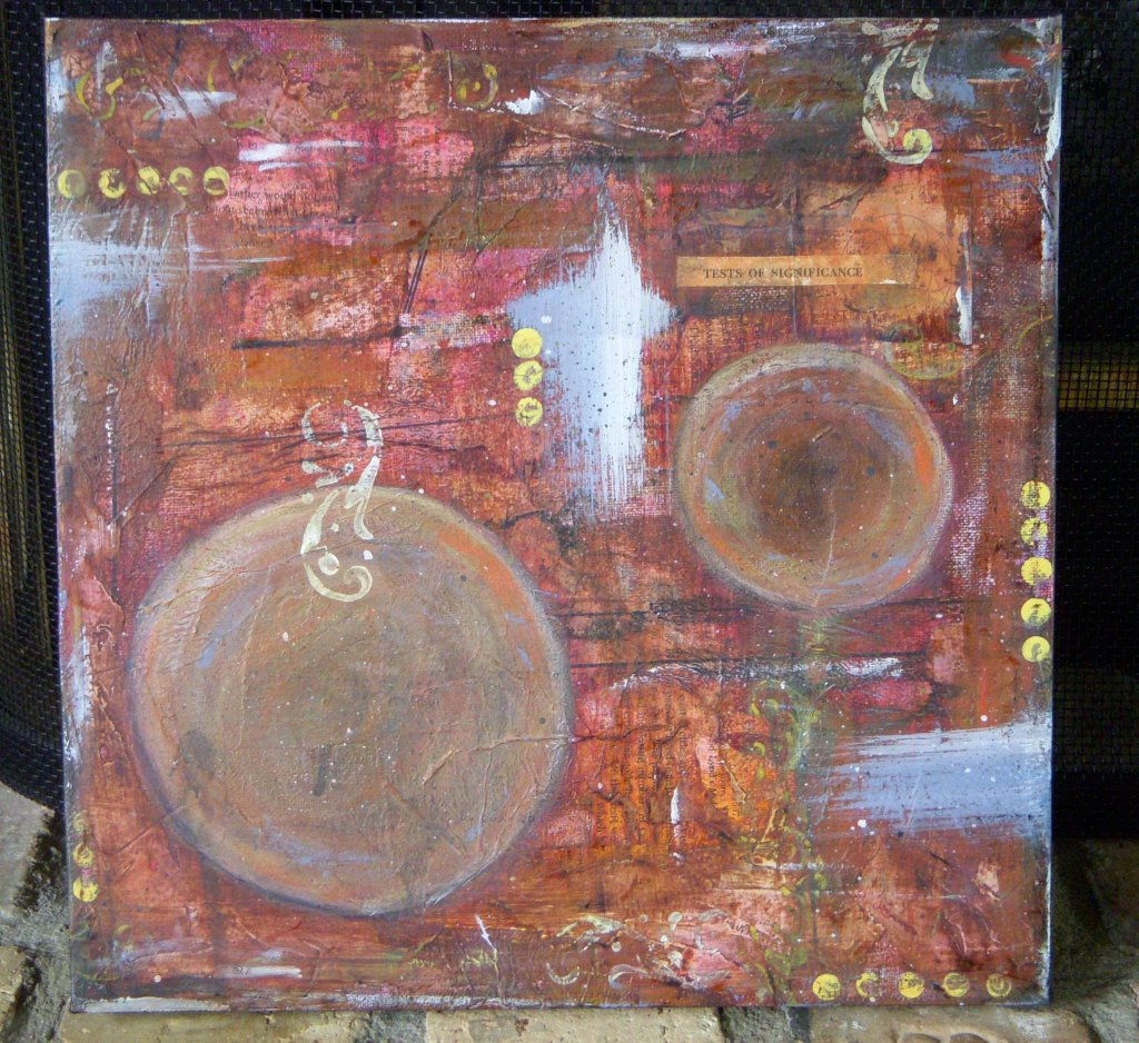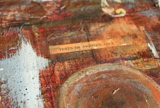 There are lots of layers on this canvas…just the way I like them. Lots of wrinkles from tissue paper, some modeling paste, book page scraps and the found text that has become the title of the piece.