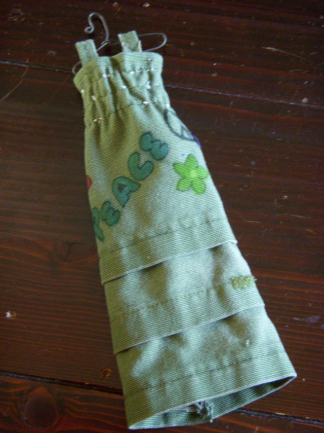 The fabric was scavenged from a pair of pants my son wore many, many years ago. I had fun drawing on the fabric with markers before sewing.