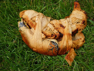 My word stack consists of rusted fabric, torn lace, bundle of green thread and the mop-up paper from the earlier sprays.