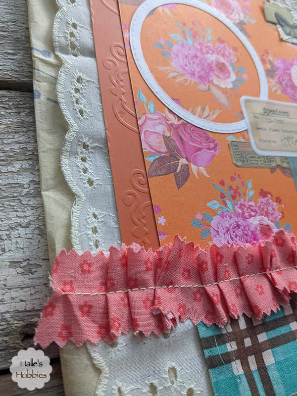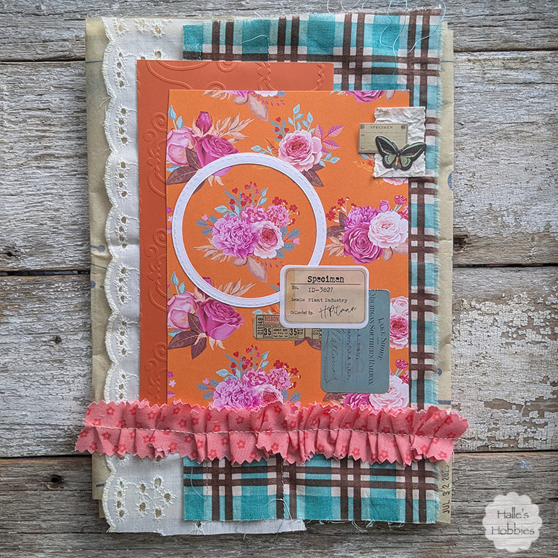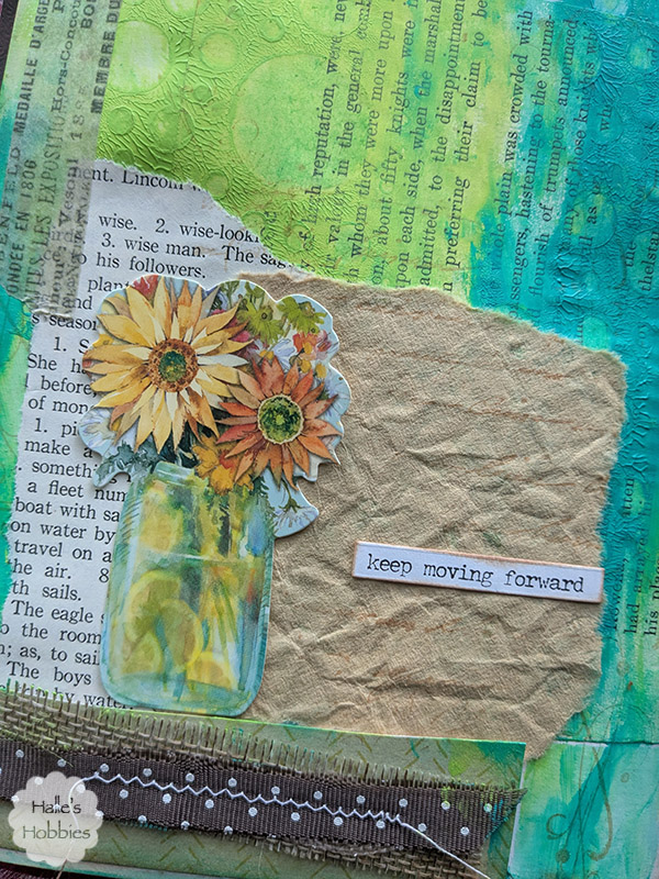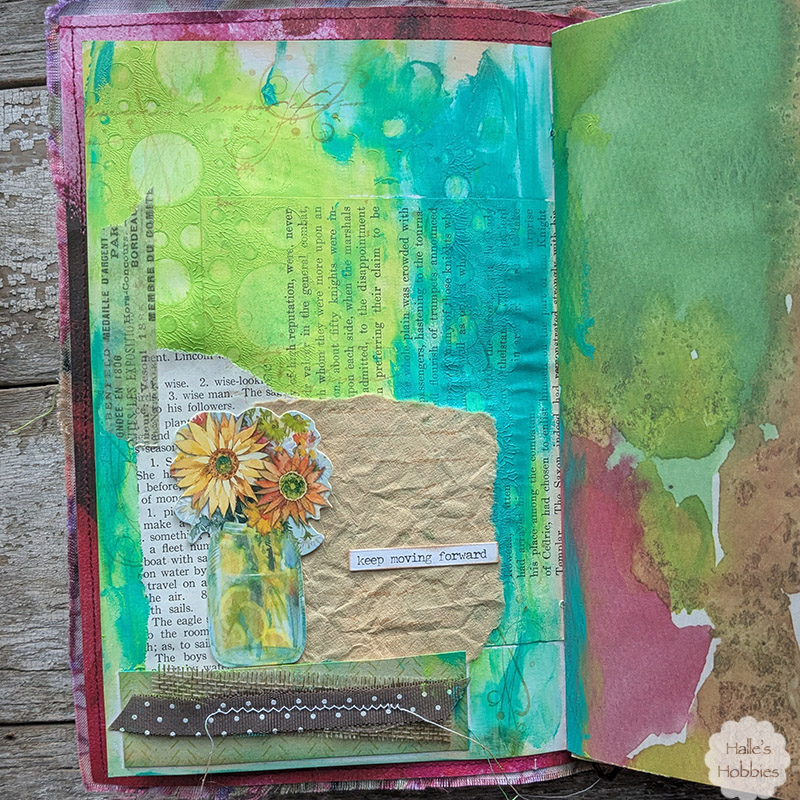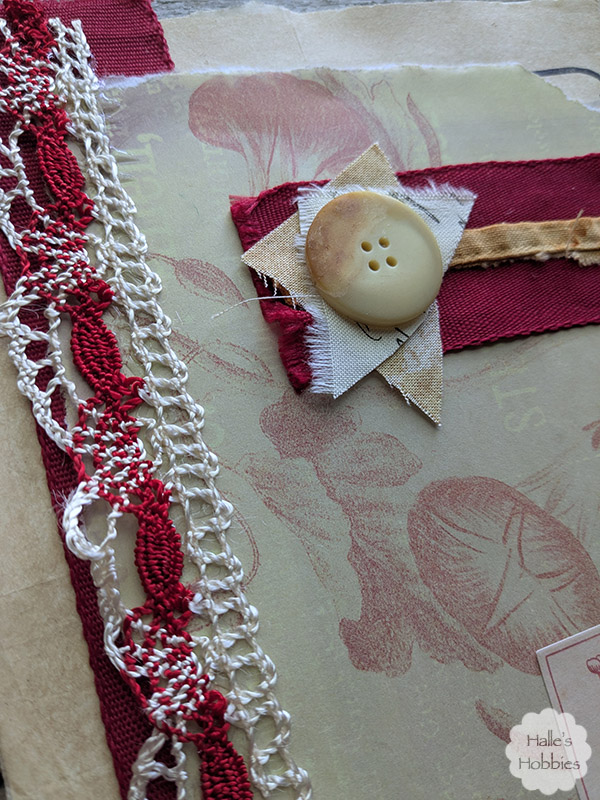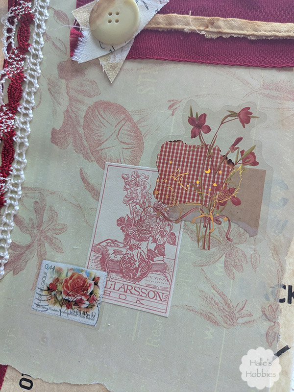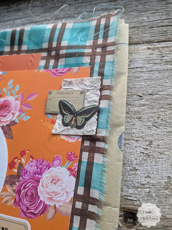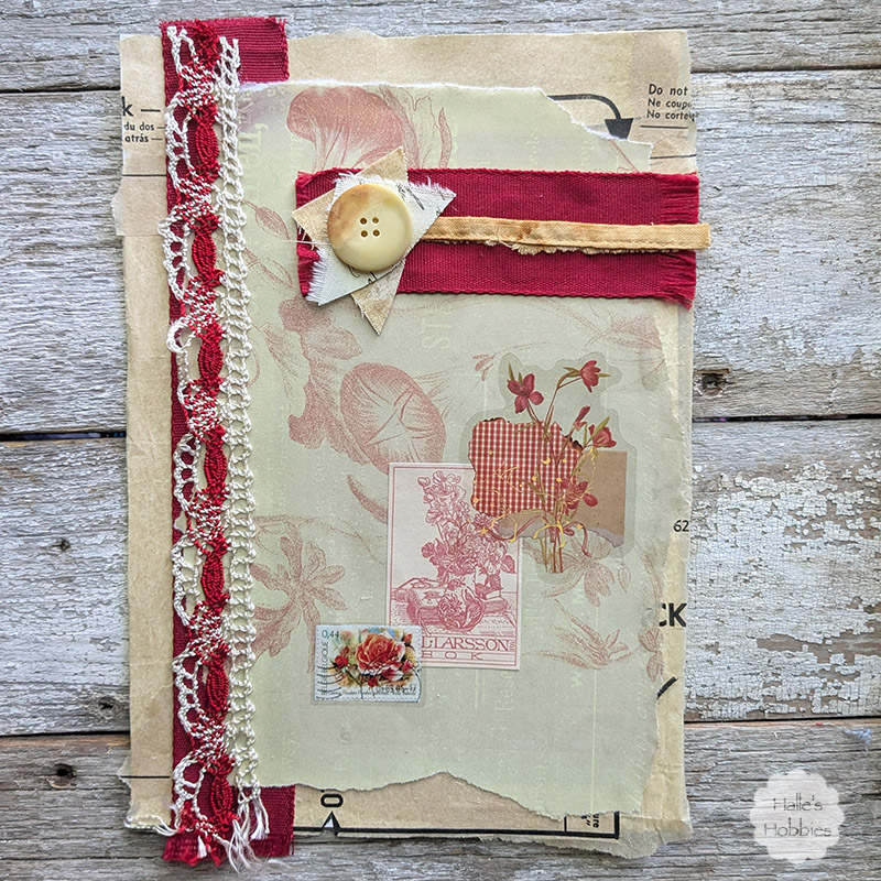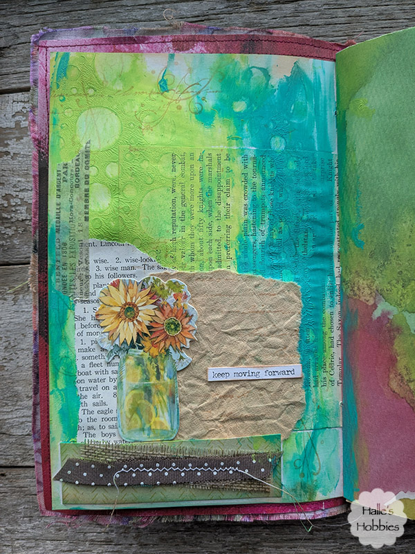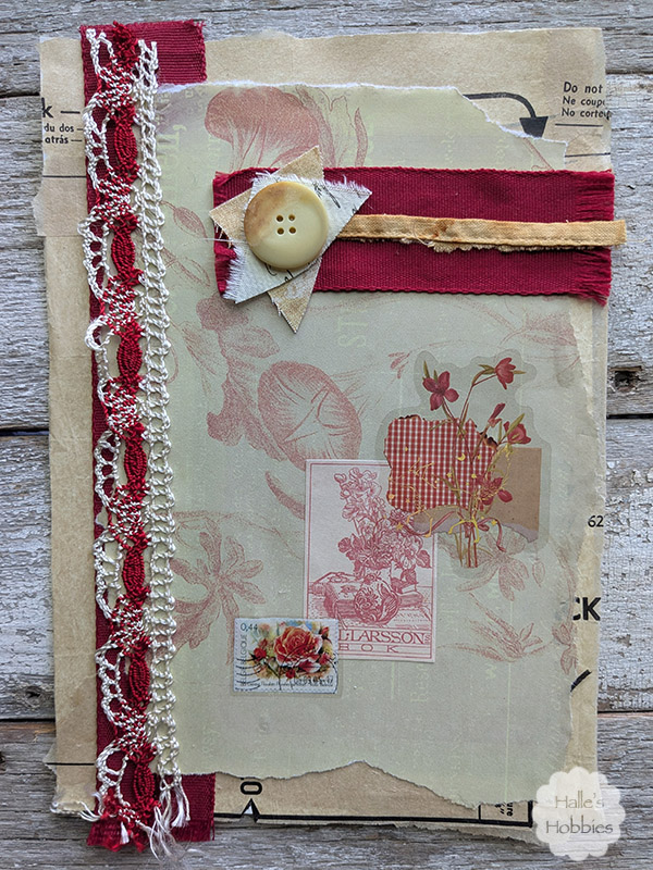 The layered paper and fabric piece at the bottom of the page was already attached as a tiny pocket before I started. I made it work with the overall design.